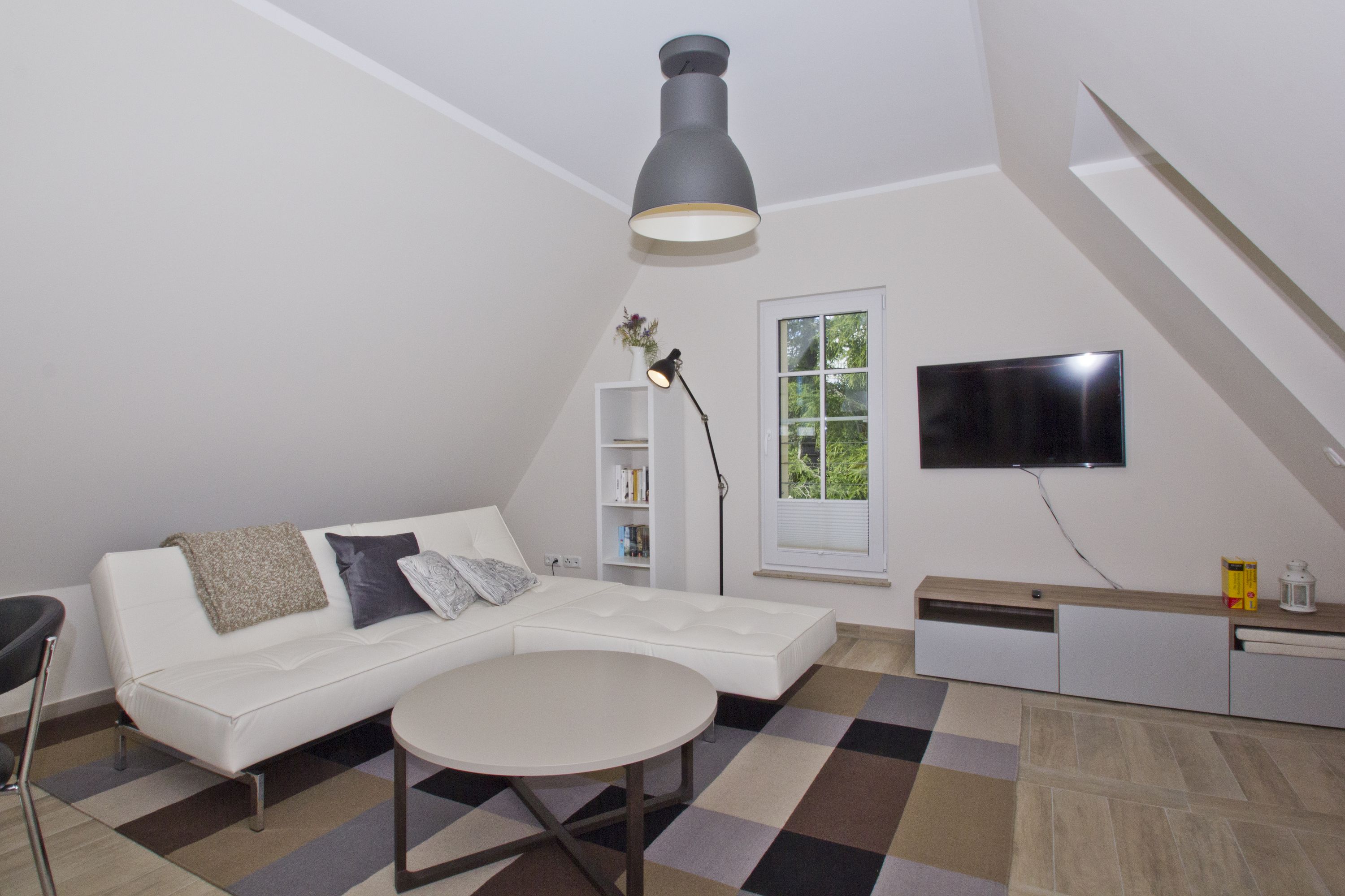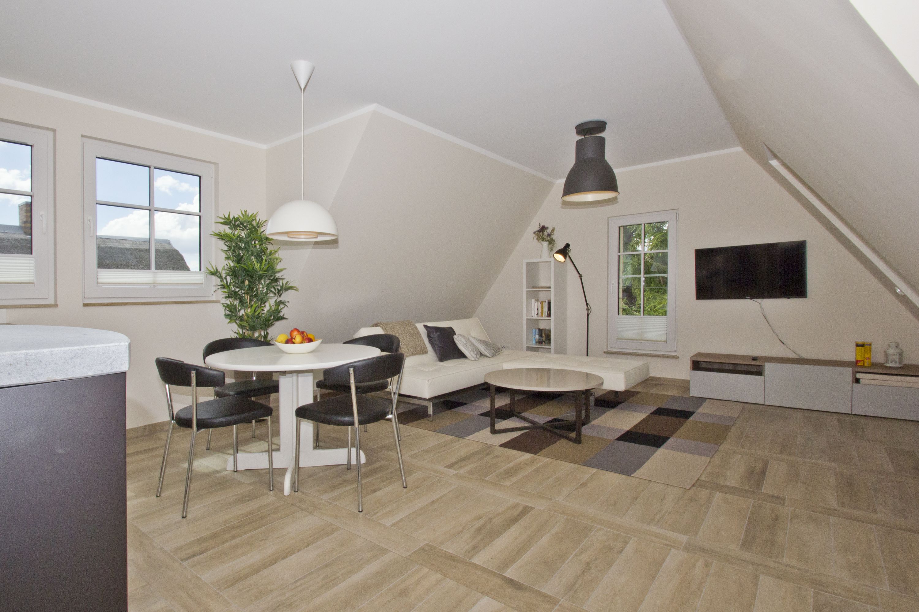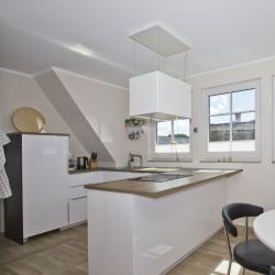 1 große helle Wohnküche mit Geschirrspühler, Herd, Mikrowelle, Speisebereich, TV und Couch