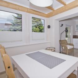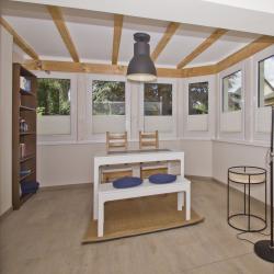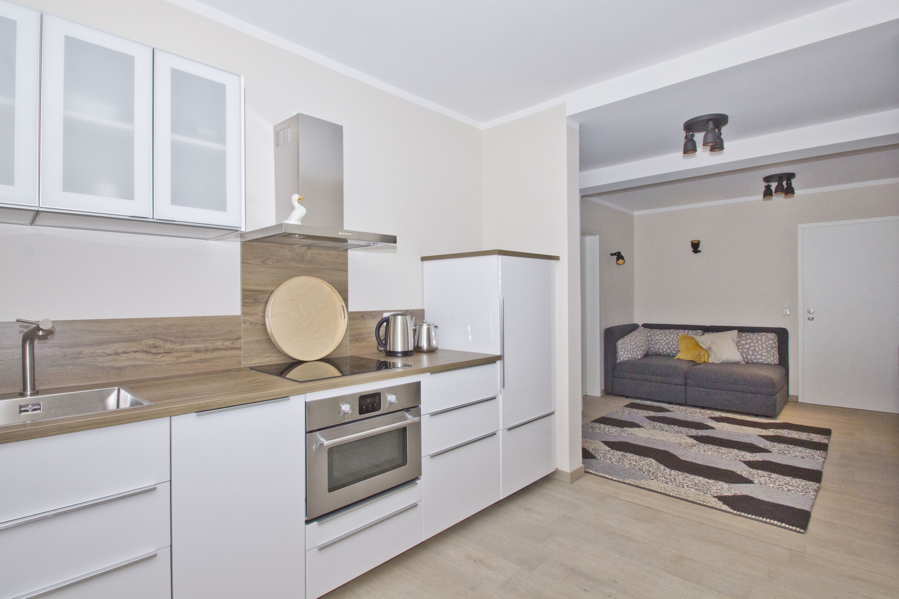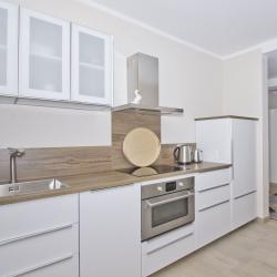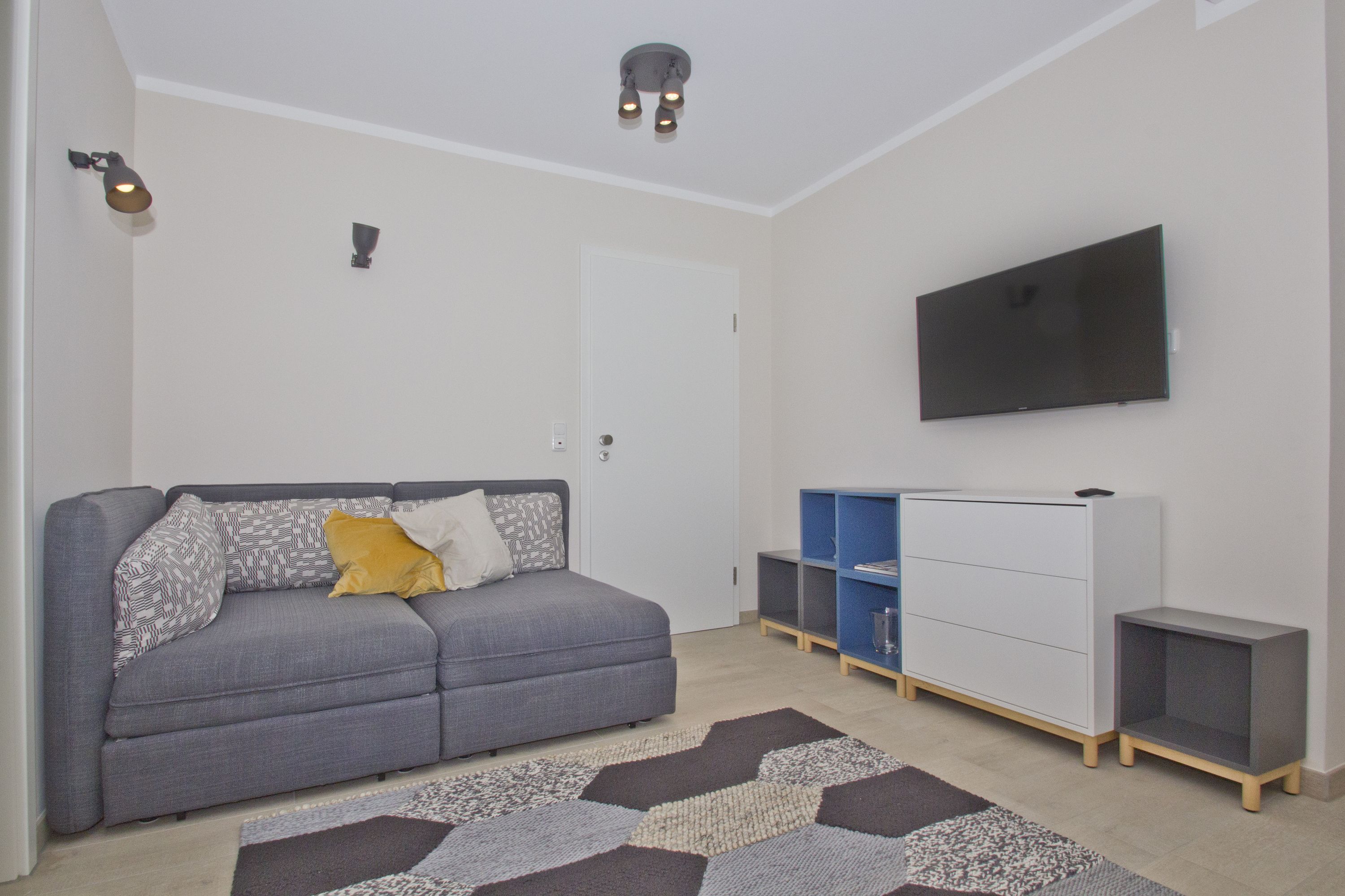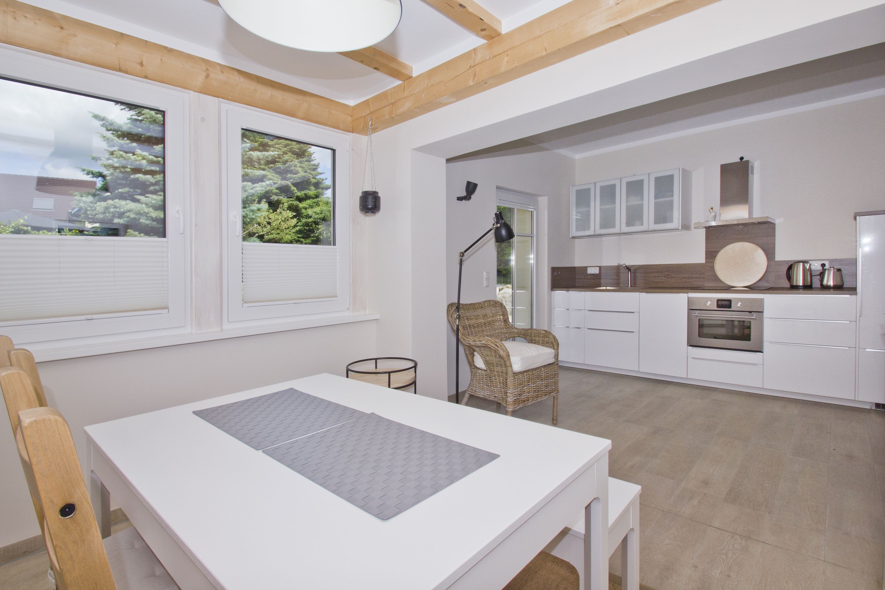 1 helle Wohnküche mit Geschirrspühler, Kochfeld, Mikrowelle, Speisebereich und Zugang zur Terasse, mit TV und Couch (ausziehbar)
